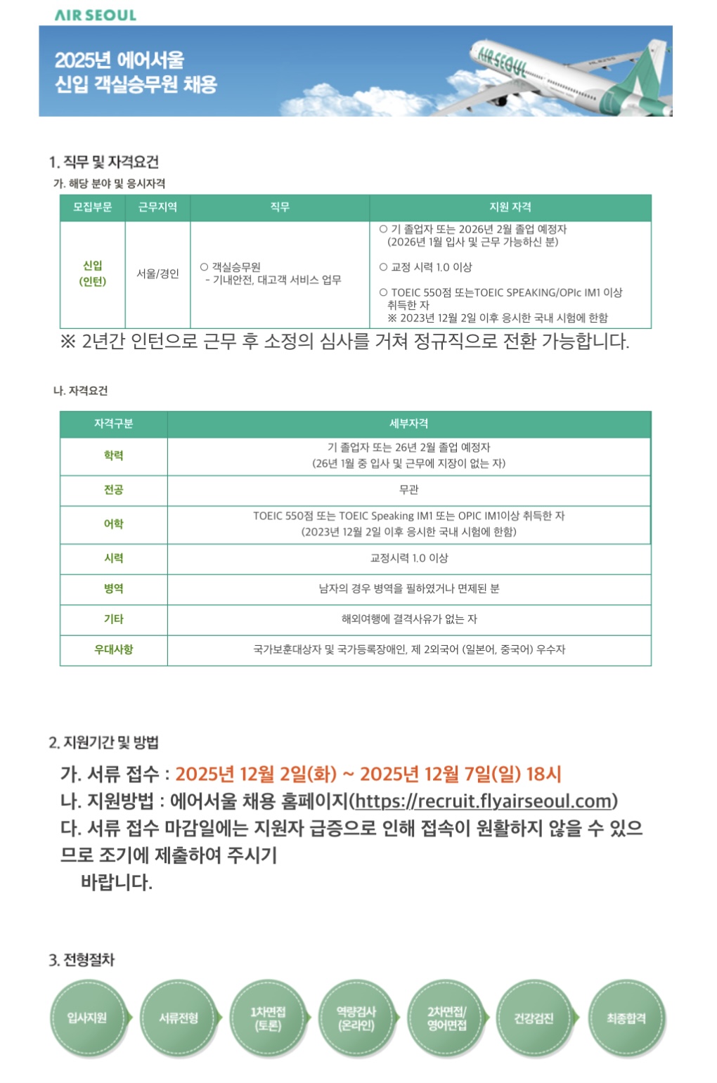 항공서비스 2025 하반기 에어서울 신입 객실승무원 모집 안내