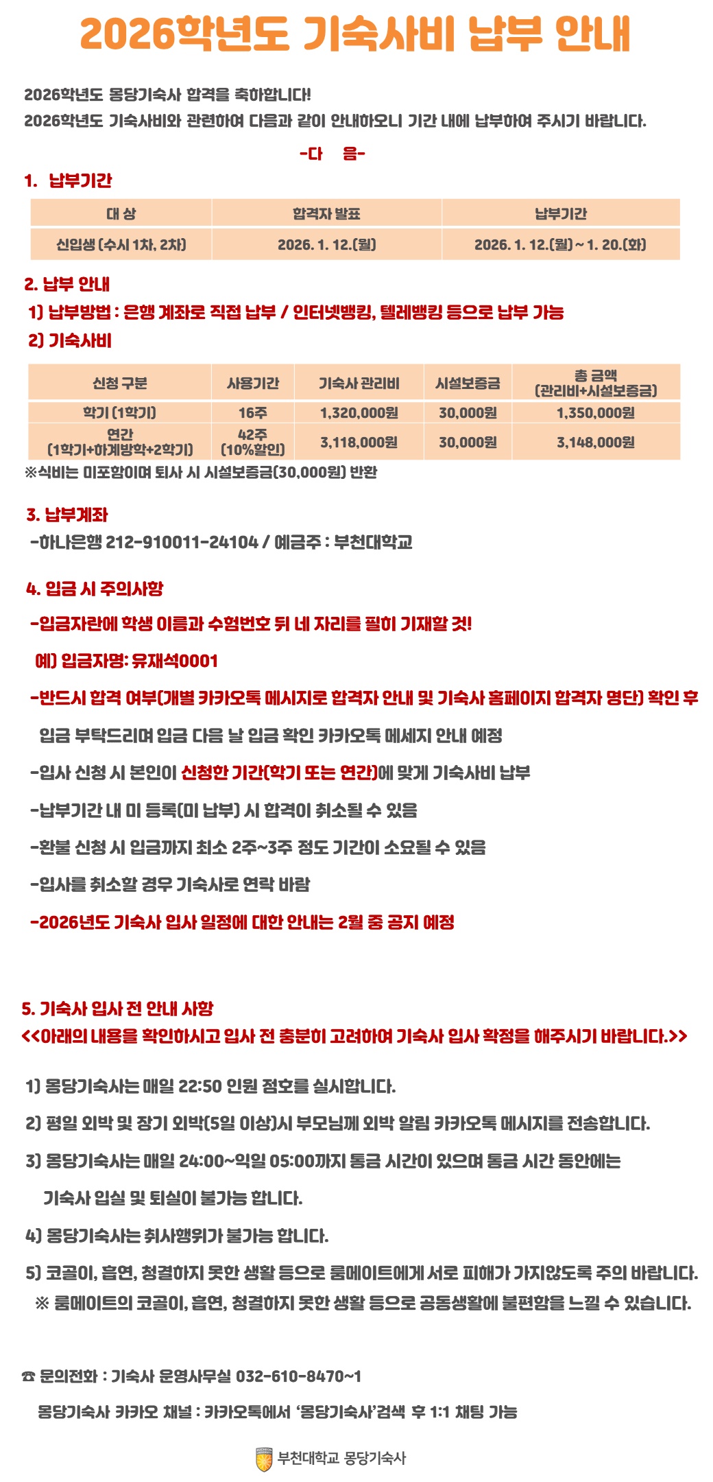 2026학년도 몽당기숙사 신입생(수시) 기숙사비 납부 안내