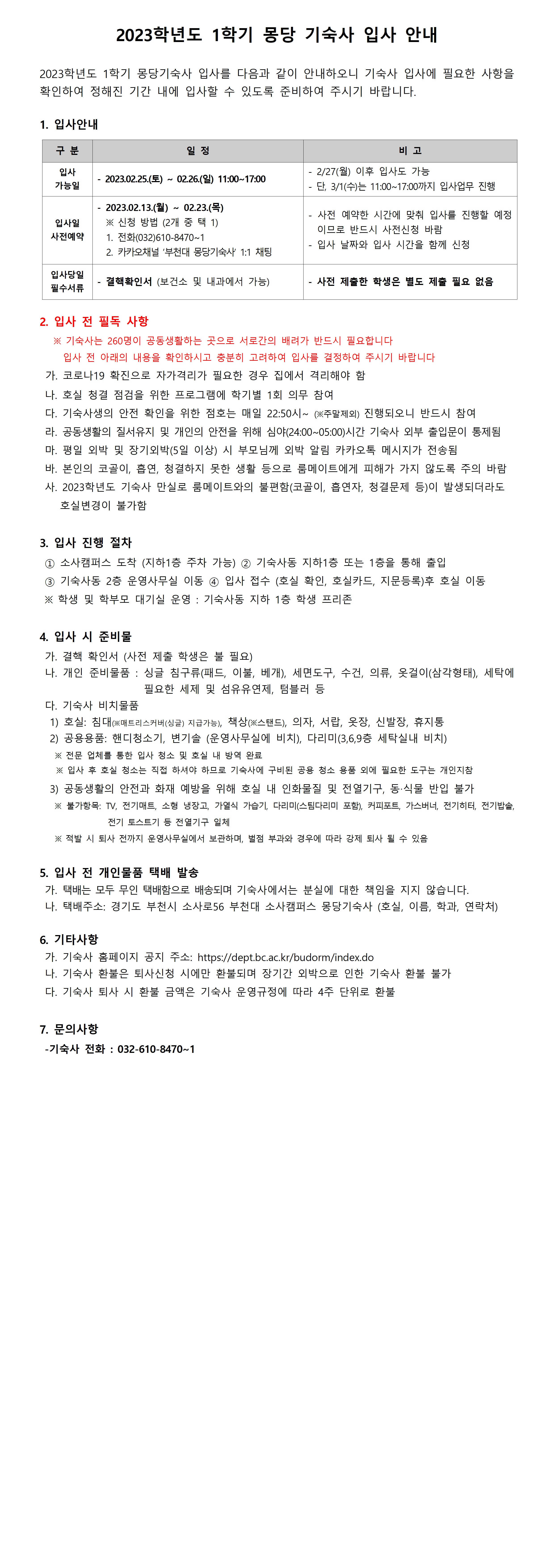 2023년 1학기 기숙사 입사 안내 공지 및 생활안내