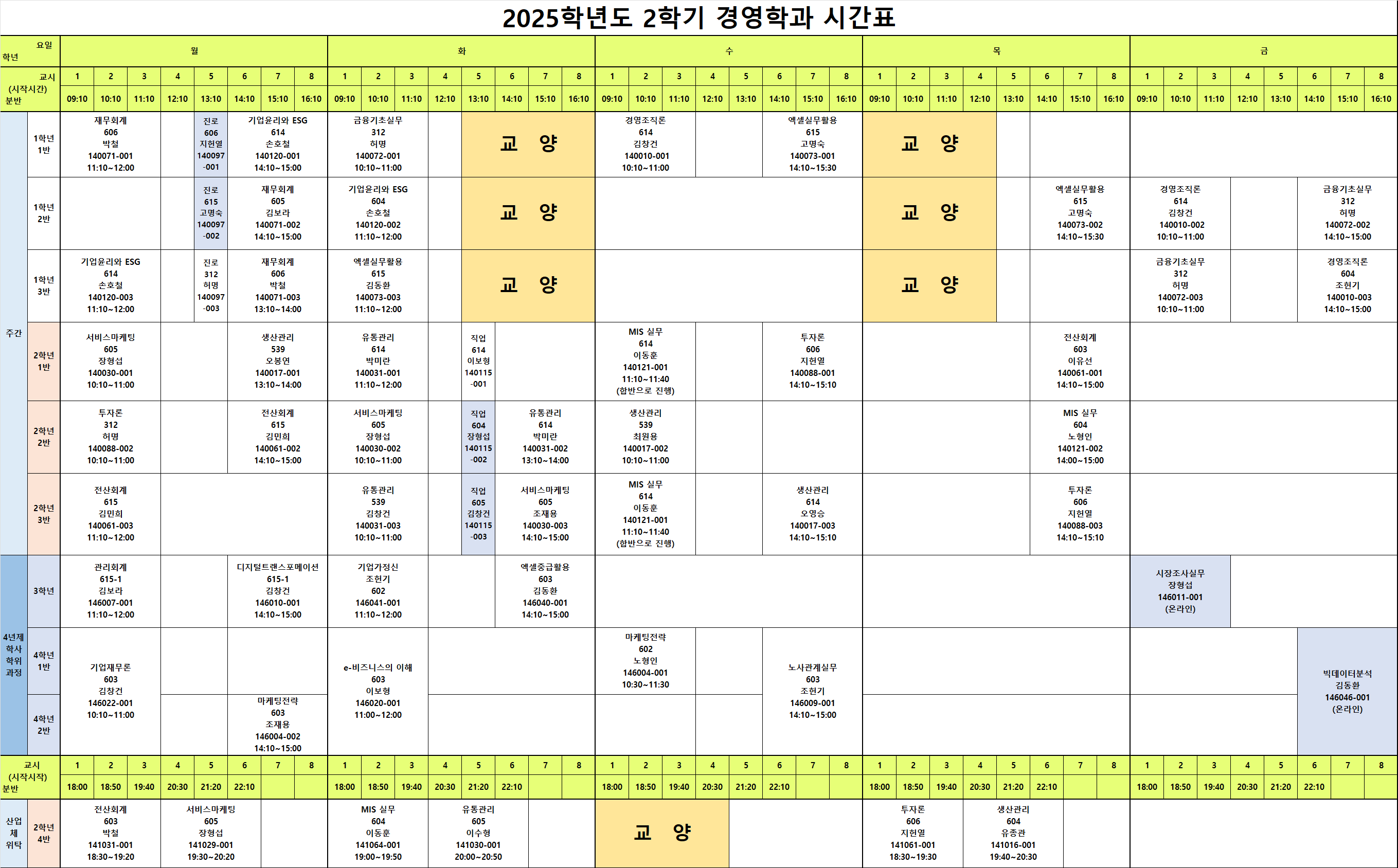 안녕하십니까, 경영학과입니다. 2025학년도 2학기 중간고사 시간표 안내드립니다. 기말고사 기간은 10월 27일(월) ~ 10월 31일(금) 입니다