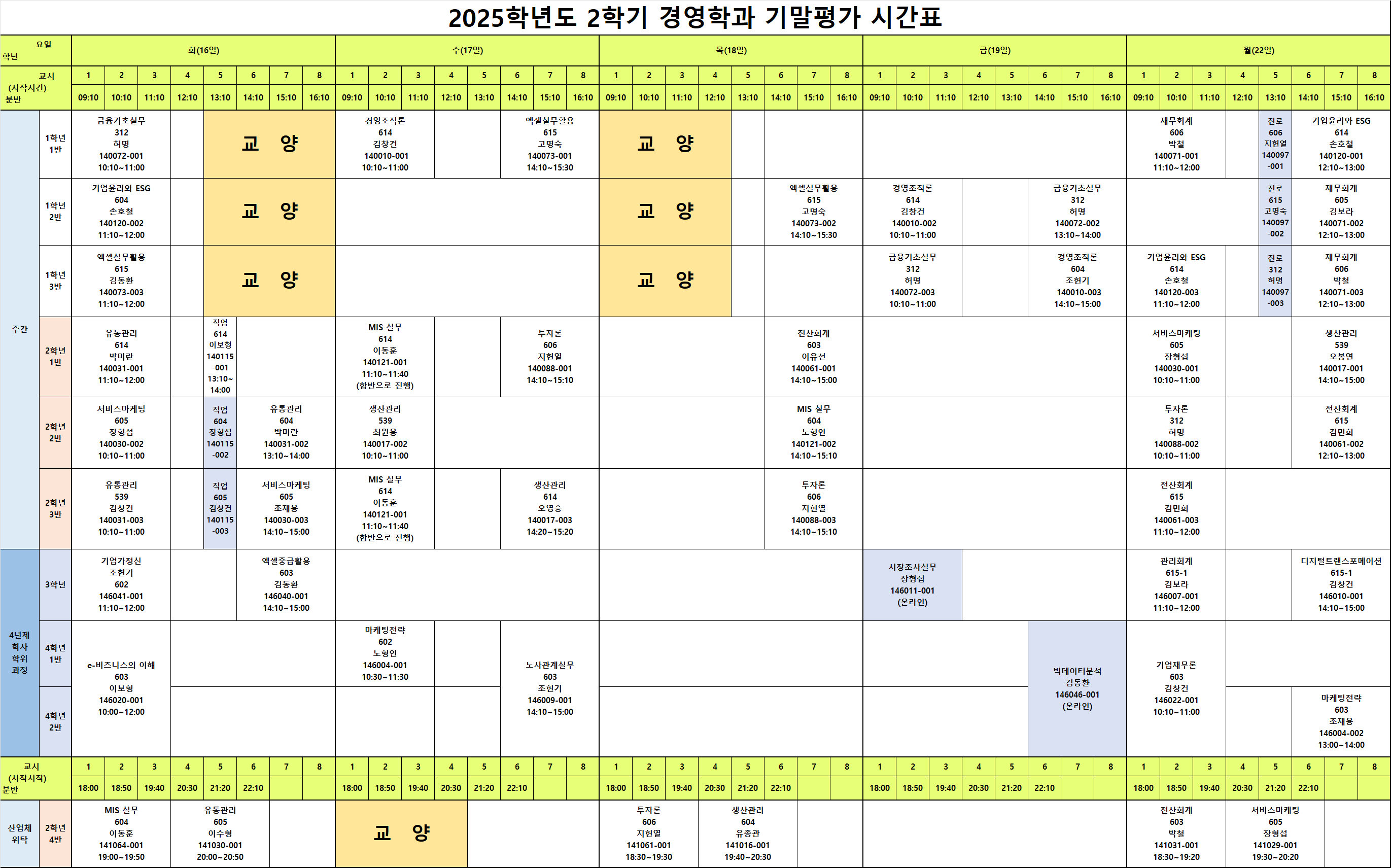 안녕하십니까, 경영학과입니다. 2025학년도 2학기 중간고사 시간표 안내드립니다. 기말고사 기간은 12월 16일(화) ~ 12월 22일(월) 입니다