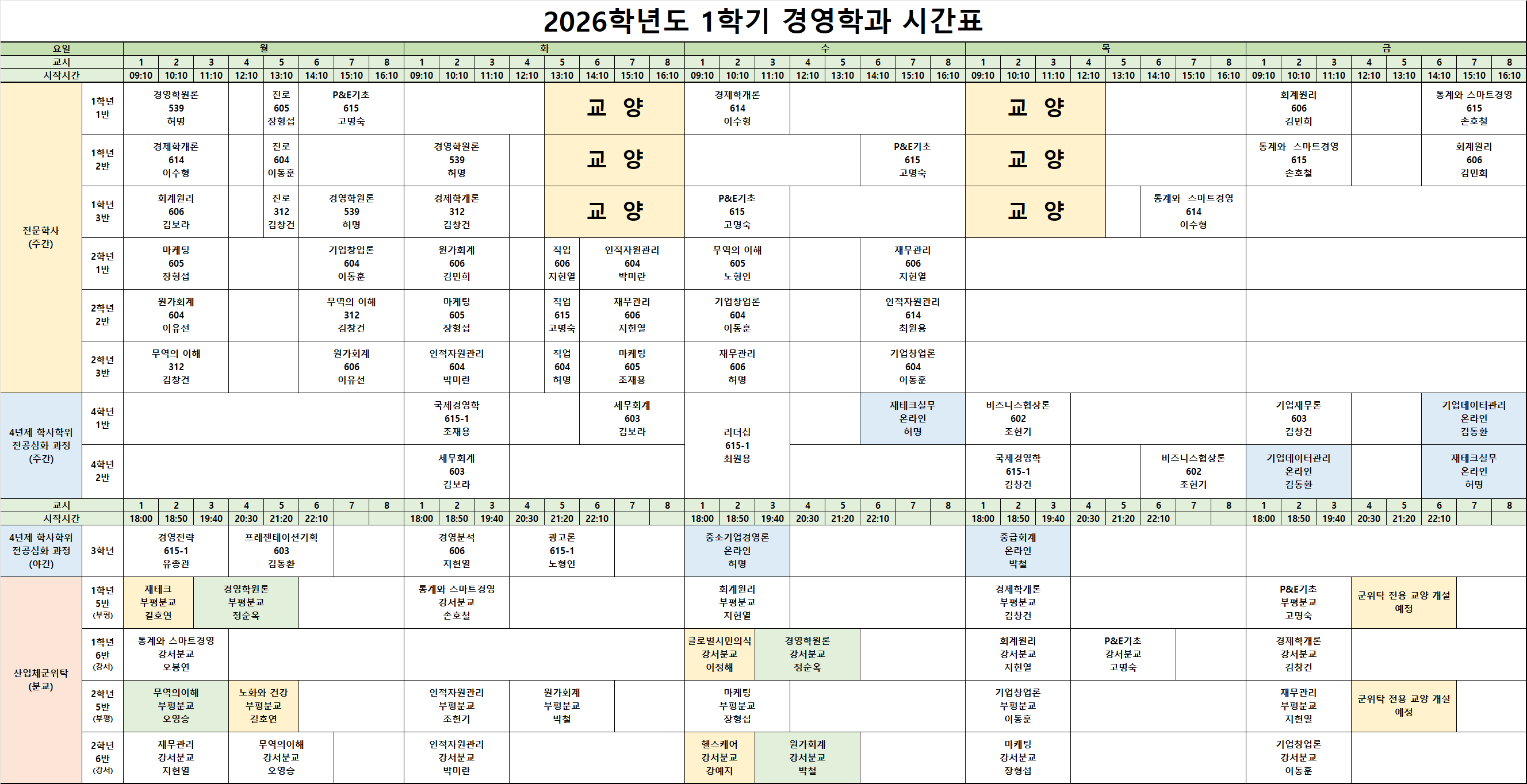 안녕하십니까, 경영학과입니다. 2026학년도 1학기 시간표 공지드립니다. 전문학사 : 최소 15학점 수강, 1학년 진로탐색/ 2학년 직업탐색 과목 필수 수강, 기초외국어능력(영어) 교양 졸업 전 1회 필수 수강 전공심화 : 12학점 이상 필수 수강