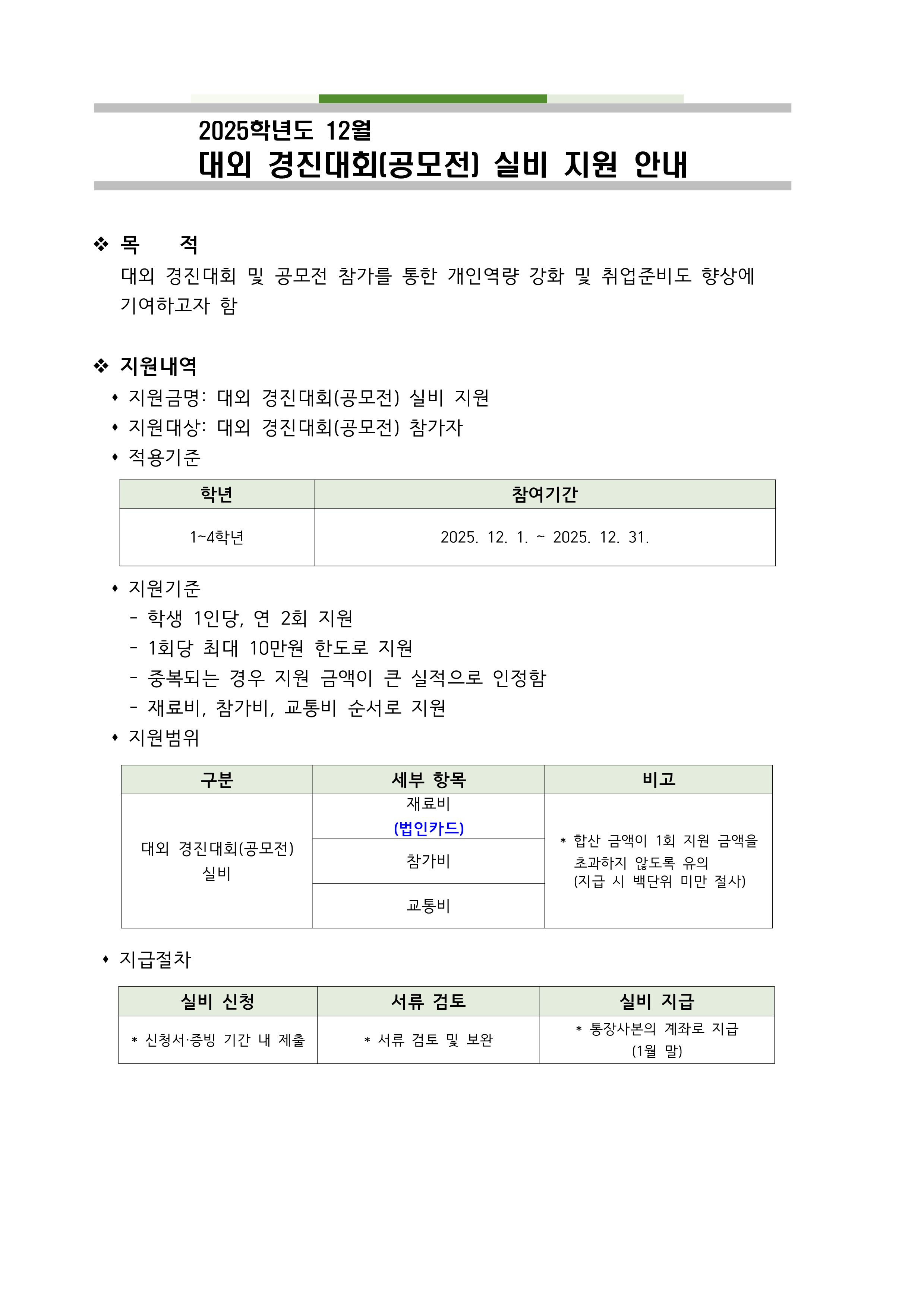 2025학년도 12월 대외 경진대회(공모전) 실비 지원 및 신청 안내