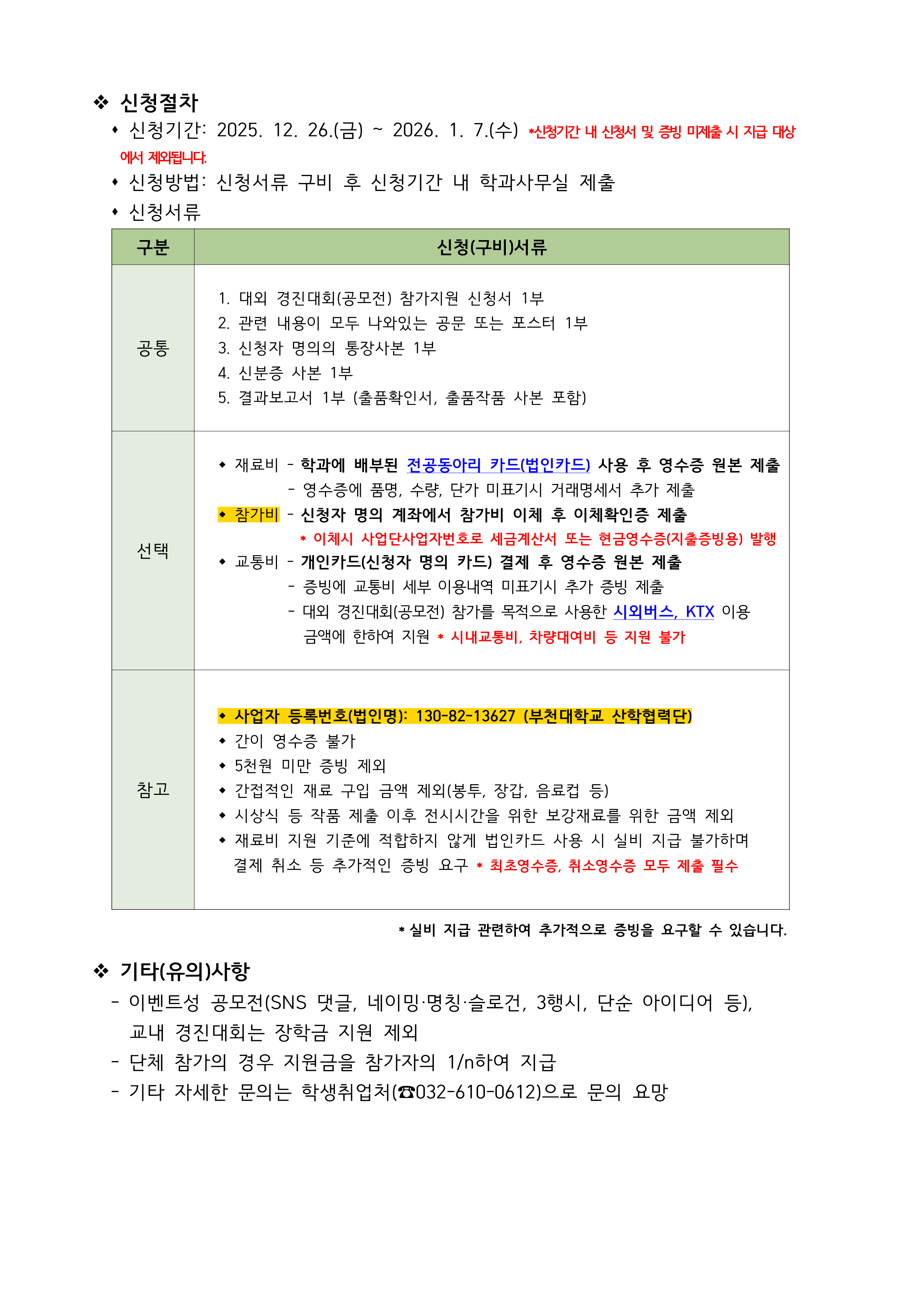2025학년도 12월 대외 경진대회(공모전) 실비 지원 및 신청 안내 1. 신청기간 (학생 제출 기한) ~ 2025.1.5 (월) 16:00 (기한 엄수) 2. 신청방법 대외 경진대회(공모전) 참가 신청서(첨부3), 참가 결과보고서(첨부2) 및 기타 증빙서류 등을 준비하여 실습조교(☎032-610-3458 or ✉rlaangks1@bc.ac.kr) 에게 제출 3. 구비서류 및 신청절차 등 자세한 사항은 위 내용 참고. 4. 그 외 문의사항 032-610-0612(담당자 학생취업처 김보민) 5. 참고 사항 - 유급자 및 장학금 지급 전 휴학자는 지원 제한됨 - 실비 지원금은 검토 후 1월 말 ~ 2월 초 지급 예정_실비_지원_안내_1.png)