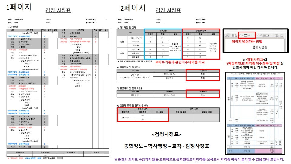 교원자격증 취득 및 졸업을 앞두고 검정사정표 조회 방법 및 유의사항 안내드립니다. 1. 검정사정표 조회 방법 - 종합정보시스템 > 학사행정 > 교직정보 > 검정사정표 조회 2. 유의사항 - '(해당년도)유치원, 어린이집 교사 자격증 이수과목 및 학점' 표를 함께 보며 확인하시기 바랍니다. - 1~2페이지 모두 확인 필요! * 자격증 이수과목 및 학점 외에도 졸업학점도 꼭 확인 바랍니다. 기타 문의사항은 학과사무실로 연락 바랍니다. 문의. 032-610-8330