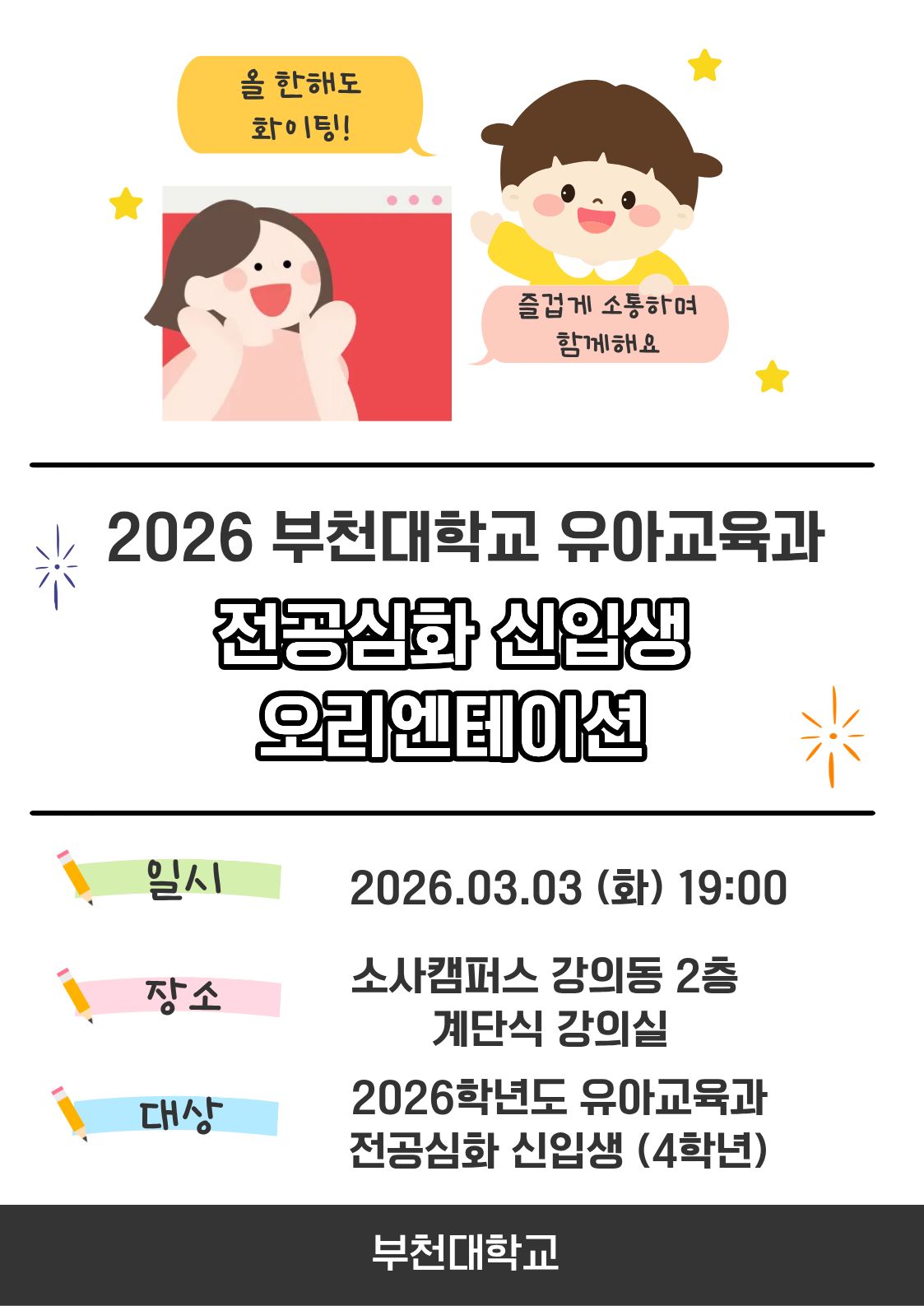 <전공심화 신입생 오리엔테이션(OT) 안내> 유아교육과 2025 전공심화 OT 일정 안내드립니다. [일시] 2025년 3월 3일(화) 오후 19:00 [장소] 소사캠퍼스 강의동 2층 계단식 강의실 K209호 [대상] 2025학년도 유아교육과 전공심화 신입생 (4학년) 궁금하신 점은 032-610-8330 / 8347 으로 연락주세요.
