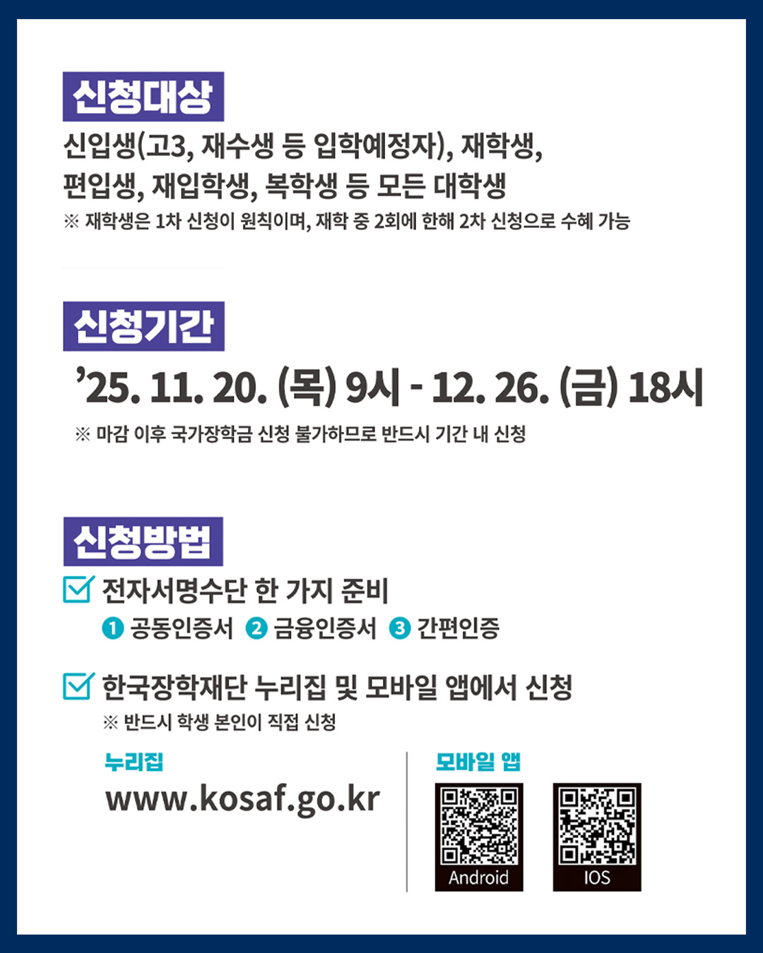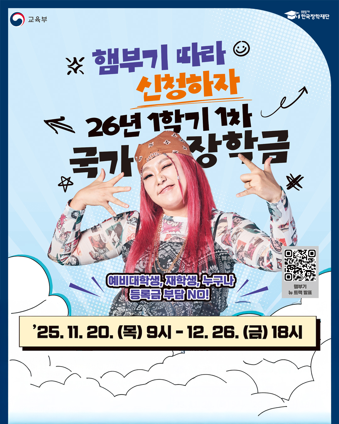📢 2026학년도 1학기 1차 국가장학금 신청 안내! 등록금 부담 줄이고, 혜택은 챙기자! ✨ 예비대학생·재학생 누구나 신청 가능해요 🙌 📝 신청기간 📅 2025. 11. 20.(목) 09:00 ~ 12. 26.(금) 18:00 ⛔ 기간 이후에는 신청이 절대 불가! 꼭 안 놓치기! 👥 신청 대상 ✔ 신입생(고3·재수생 등 입학예정자) ✔ 재학생(⚠ 재학생은 1차 신청이 원칙!) ✔ 편입생·재입학생·복학생 등 모든 대학생 ☎ 문의 📞 한국장학재단 상담센터 1599-2000 💬 국가장학금 신청 챗봇 상담도 가능해요! 📌 2026년도 1학기 등록금 지원을 위해 꼭 신청해주세요! 여러분의 부담을 줄여주는 가장 확실한 방법! 부천대학교는 여러분의 학업을 응원합니다! 💙✨ #사람다운_사람 #사람과_일의_가치 #부천대학교 #Bucheon_university #식품영양학과