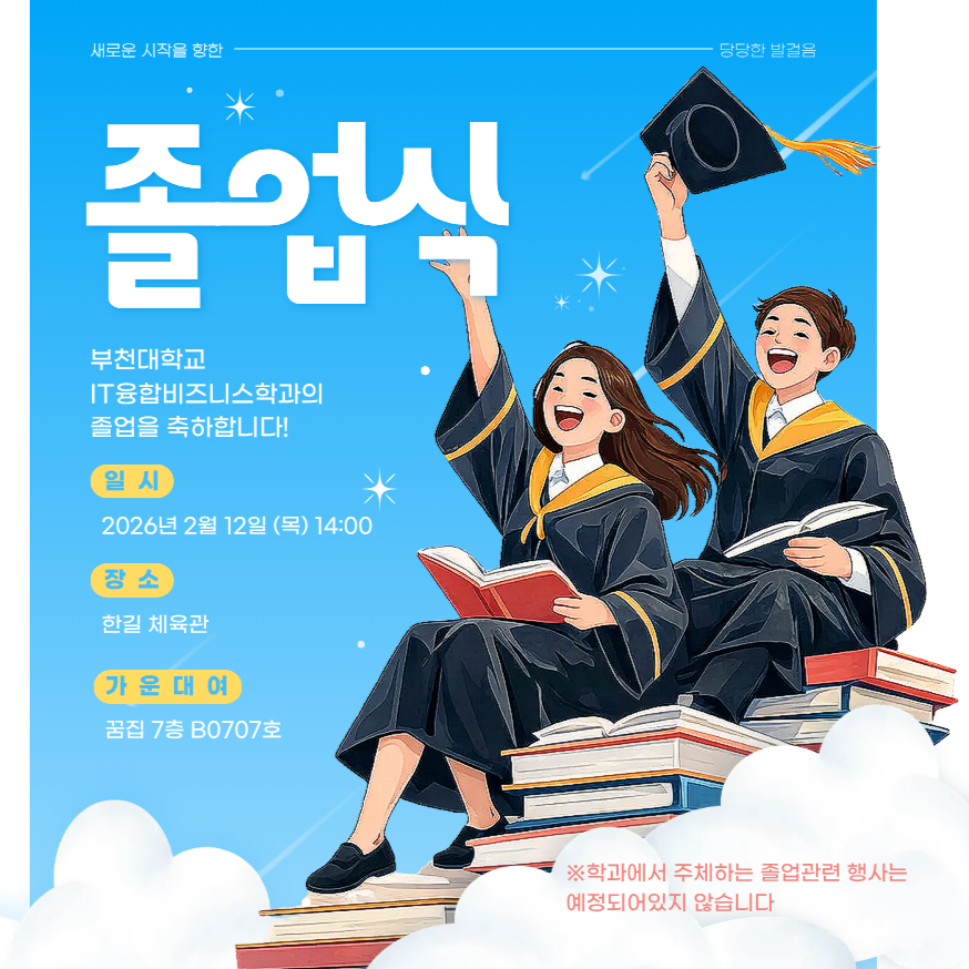 졸업 가운 대여 : 꿈집 7층 B0707호 (추후 시간 공지예정) ※학과에서 주체하는 졸업관련 행사는 예정되어있지 않습니다. 졸업을 축하합니다!!