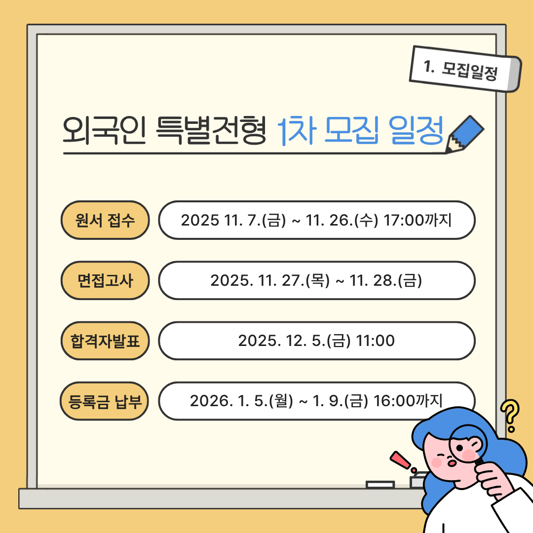 2026학년도 전기 입학 정원 외 외국인 특별전형 1차 모집이 이번 주 금요일, 11월 7일부터 시작됩니다!📢🎓