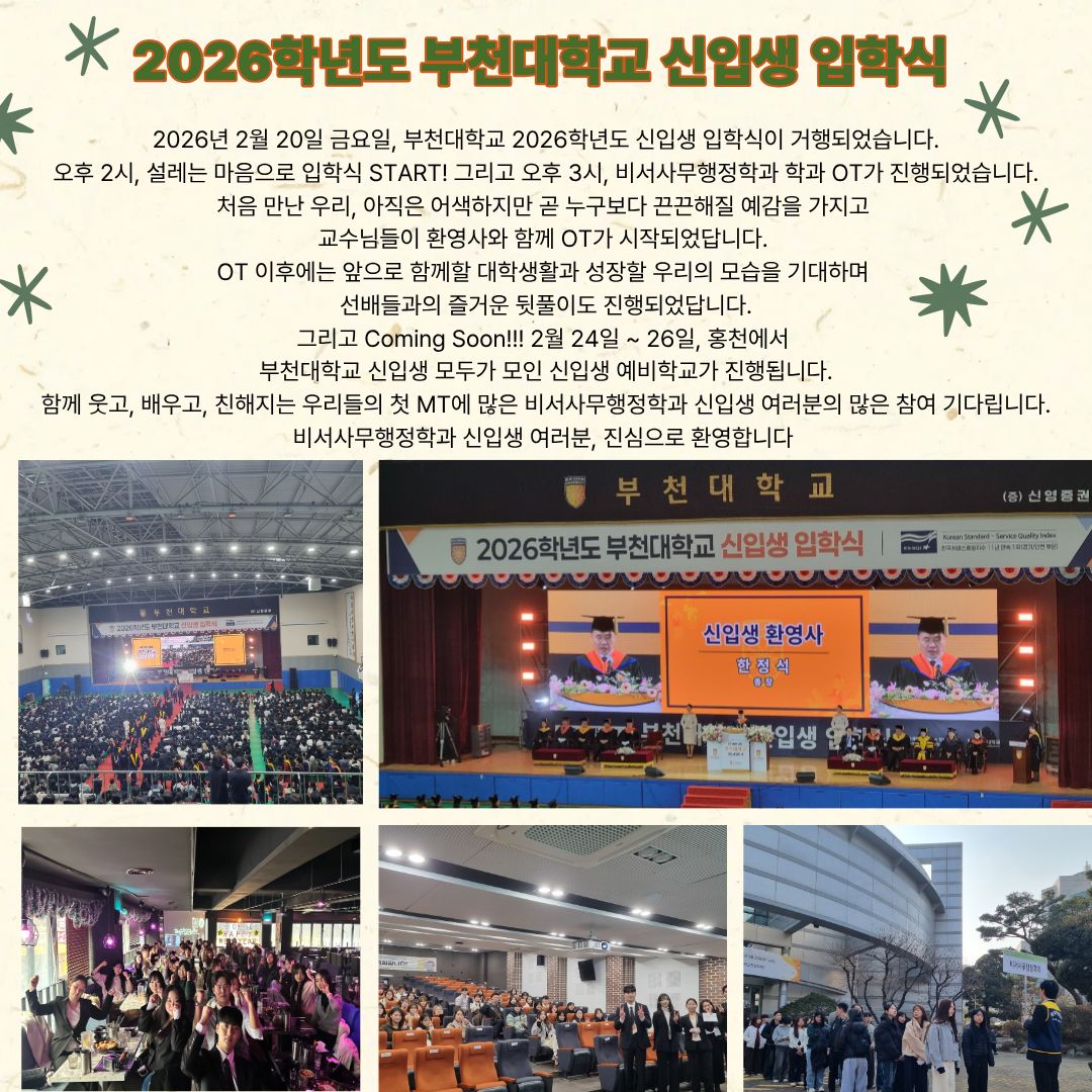 2026년 2월 20일 금요일 💙 오후 2시, 설레는 마음으로 입학식 START 🎓 처음 만난 우리, 아직은 어색하지만 OT 이후에는 앞으로 함께할 대학생활과 그리고 Coming Soon 📢 #부천대학교 #2026신입생 #입학식 #비서사무행정학과