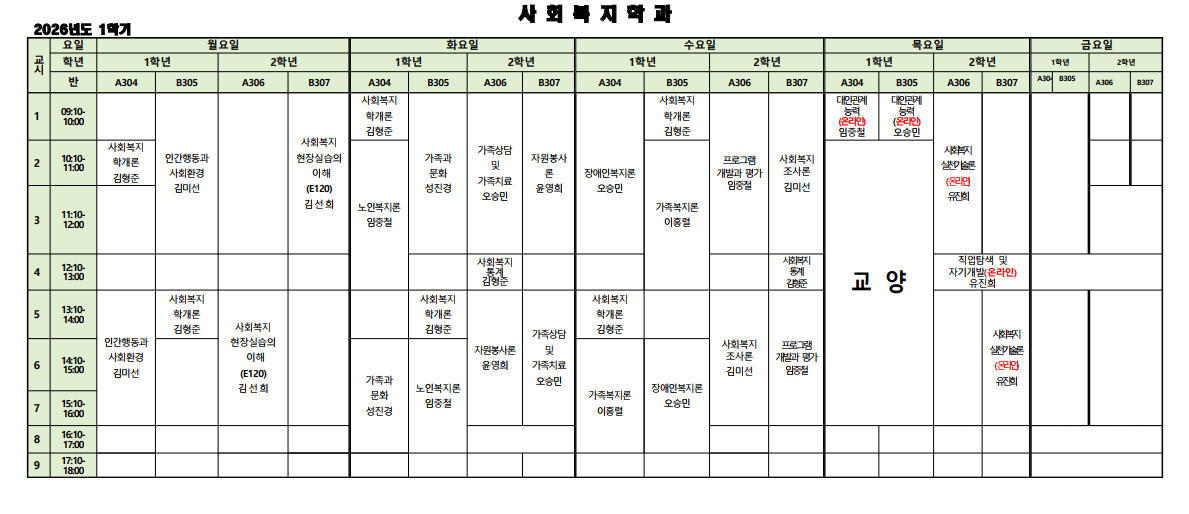 안녕하세요, 사회복지학과 행정조교입니다. 2026학년도 1학기 전공 시간표를 안내드리니 참고하시기 바랍니다. 감사합니다.