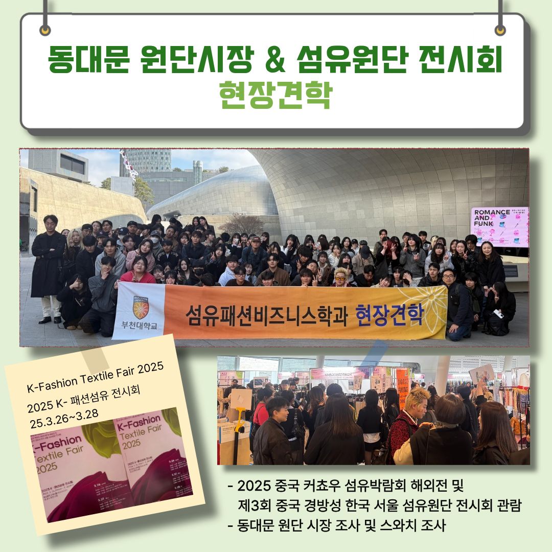 안녕하세요 섬유패션비즈니스학과입니다! 2025년도 중국 커쵸우 섬유박람회 해외전이 개최되어 섬유패션비즈니스학과 학생들과 함께 현장견학을 다녀왔습니다~ 일시: 2025.03.28 장소: 동대문역사문화공원역 1번 출구 DDP 대상: 전문학사 1,2학년 규모가 작지 않은 패션섬유 전시회에서 학생들이 다양한 소재들을 경험할 수 있었습니다! 제3회 중국 경방성 한국 서울 섬유원단 전시회를 관람함으로써 학생들이 섬유 관련 직종에도 관심을 넓힐 수 있었다고 합니다~ 또한 전시회 관람이 끝난 후 동대문 원단시장을 구경함으로써 현재 트렌드가 무엇인지에 대해 조사하고 시각의 폭을 넓이는 계기가 되었습니다! ❤25학년도 새학기가 시작된 지금 학생들의 무궁한 발전을 응원합니다~!❤