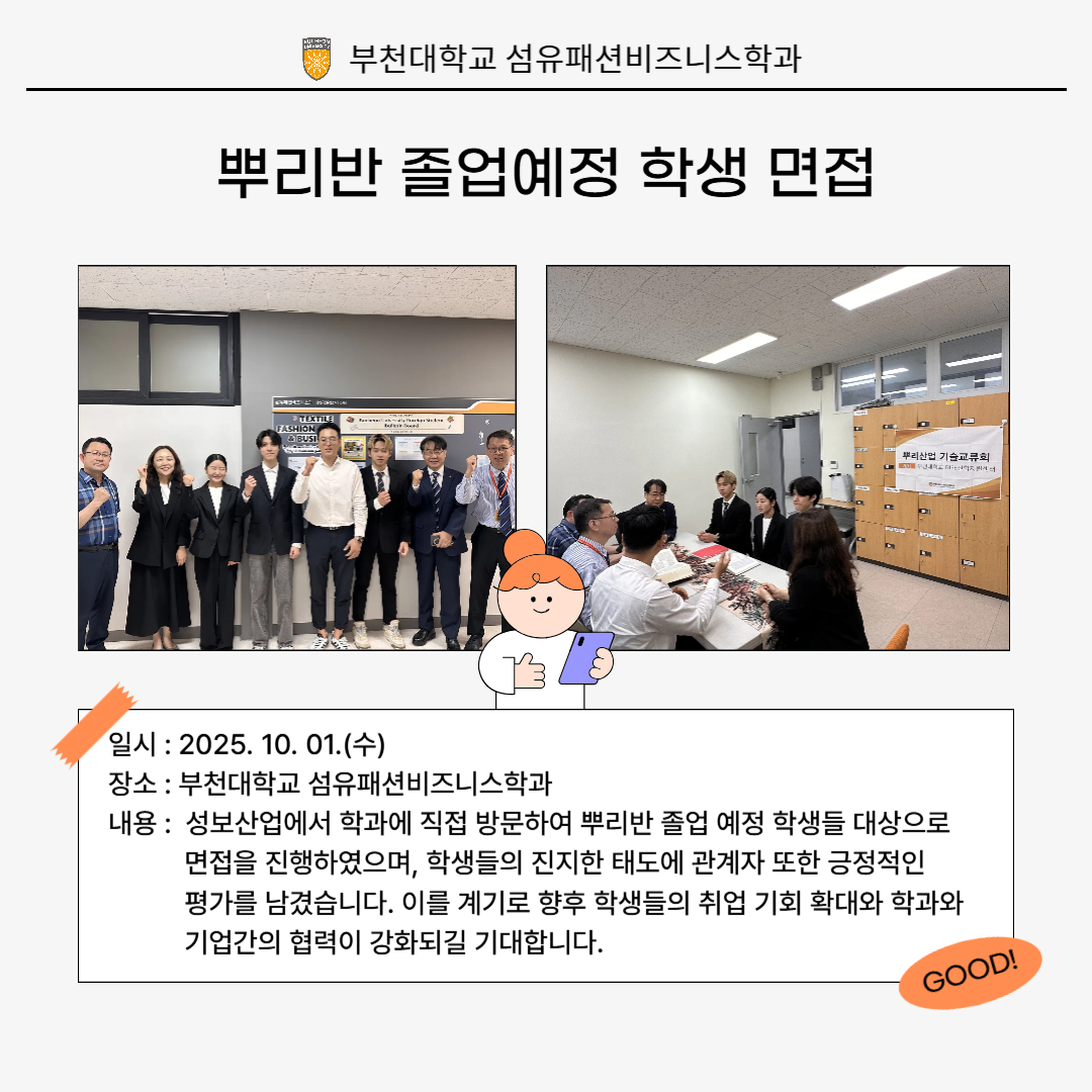 안녕하세요 부천대학교 섬유패션비즈니스학과입니다. 2025년 9월 24일 성보산업에서 학과에 직접 방문해주셔서 뿌리반 졸업 예정학생 면접을 진행하였습니다. 이번 계기를 통해 뿌리반 학생들의 취업 기회가 확대되고 학과와 기업 간의 협력이 강화되길 기대합니다. #부천대학교 #부천대 #섬유패션비즈니스학과 #섬패비 #뿌리반 #성보산업