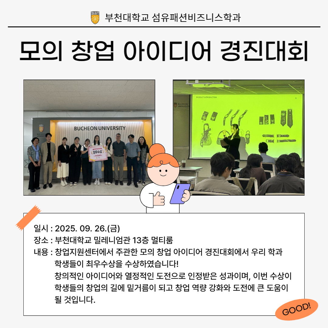 안녕하세요 부천대학교 섬유패션비즈니스학과입니다. 2025년09월 26일 교내 모의 창업 아이디어 경진대회에서 우리 학과 학생팀이 멋진 아이디어와 열정으로 최우수상을 수상하였습니다! 이번 성과가 앞으로의 창업의 길에 밑거름이 되고 새로운 도전에 용기를 주는 계기가 되길 기대합니다. #부천대학교 #부천대 #섬유패션비즈니스학과 #섬패비 #모의창업 #창업아이디어 #도전