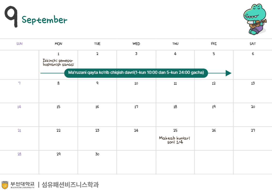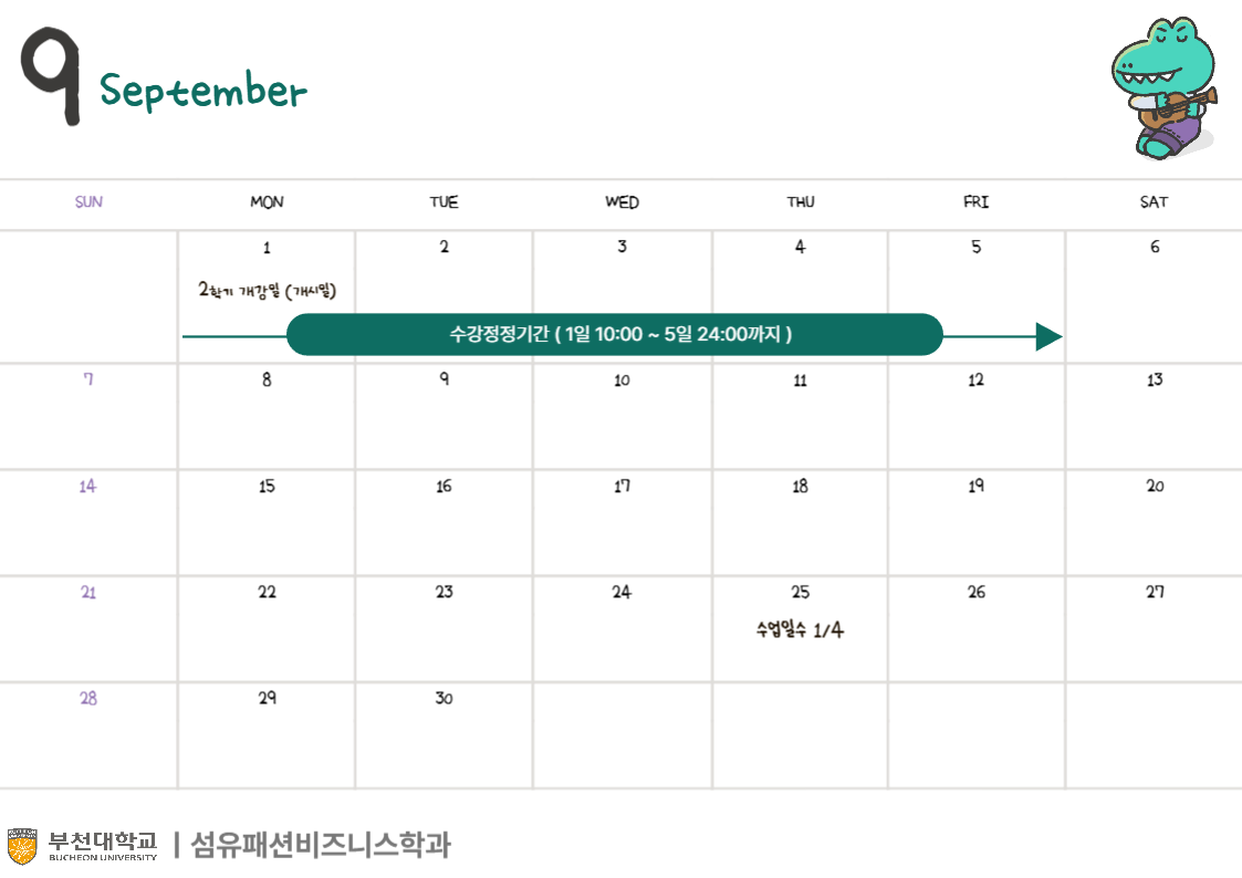 안녕하십니까, 부천대학교 섬유패션비즈니스학과입니다. 2025학년도 9월 학사일정을 공지합니다. 새 학기가 시작되는 9월, 선선한 가을 바람과 함께 활기찬 시작하시고, 알찬 학업과 의미 있는 시간 보내시길 바랍니다! 🍁📚 #부천대학교 #섬유패션비즈니스학과 #섬패비 #섬유과 #9월 #학사일정